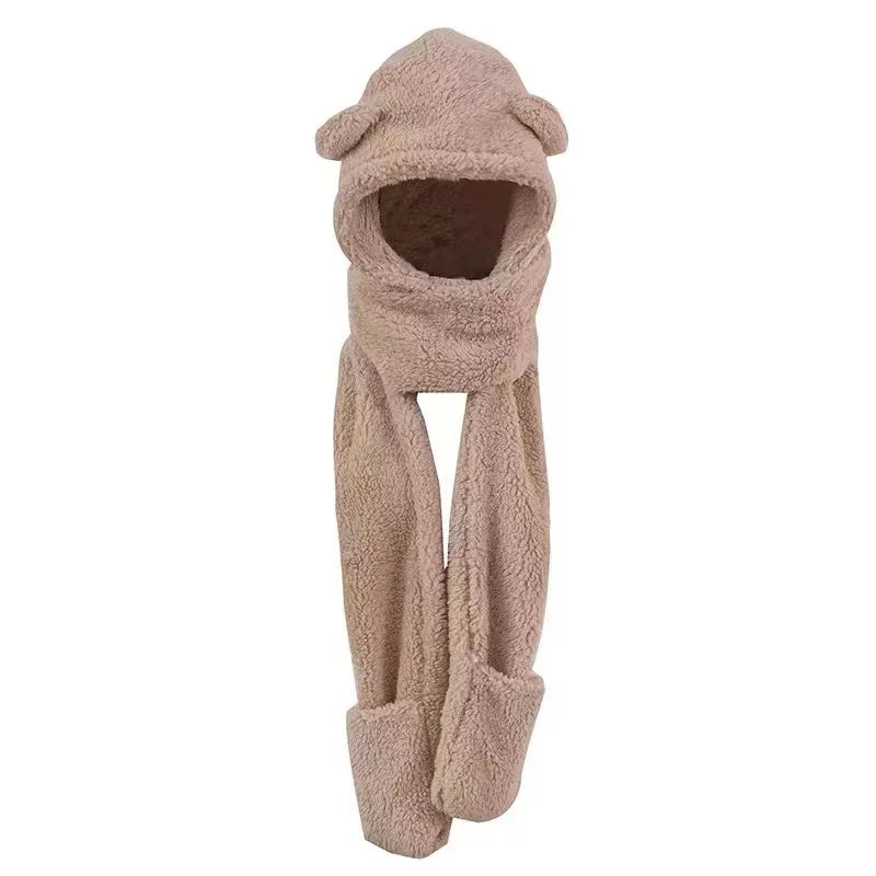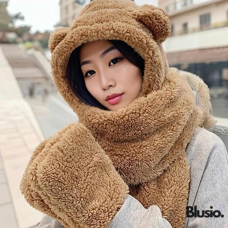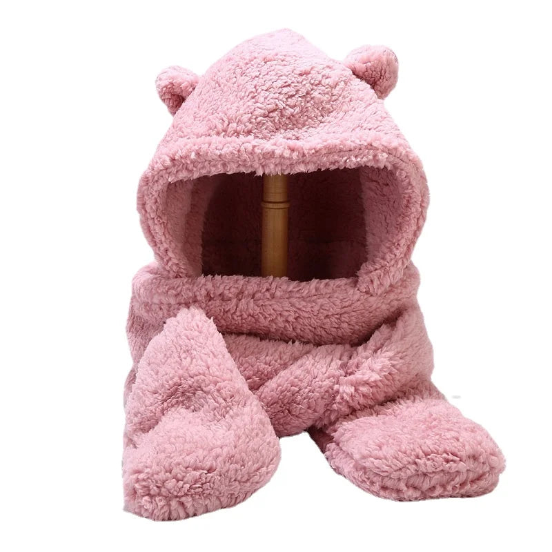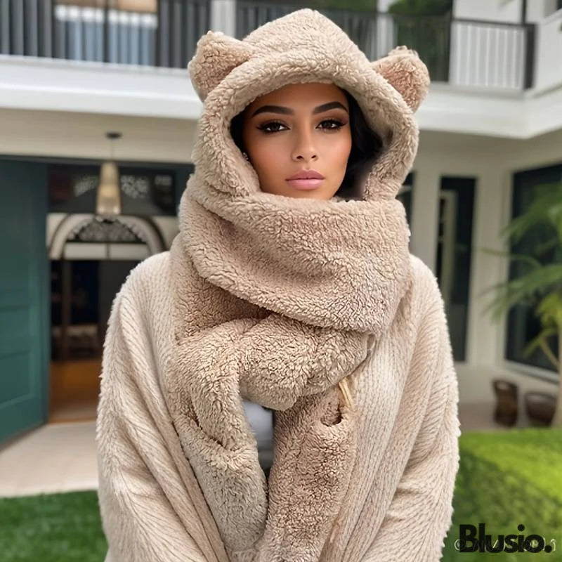 3u1 set koji uključuje toplu, meku, plišanu kapuljaču, rukavice i šal.
