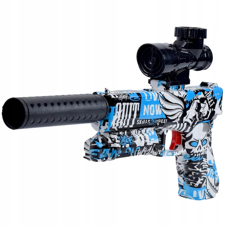 Ovaj dječji pištolj za prskanje ima električni pogon i potpuno automatski gađa perle od vodenog gela, a postoji i opcija ručnog režima gde ispaljuje jednu po jednu kuglicu.