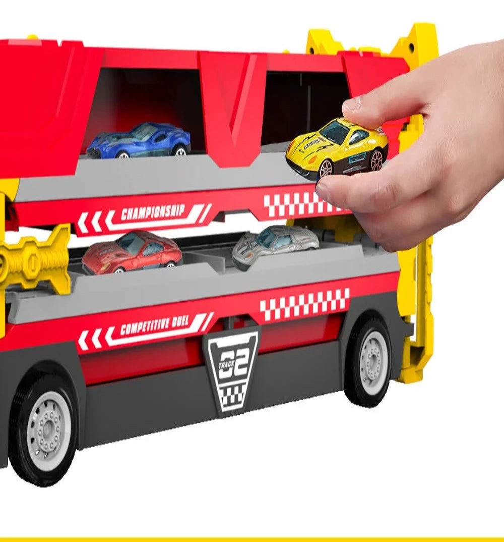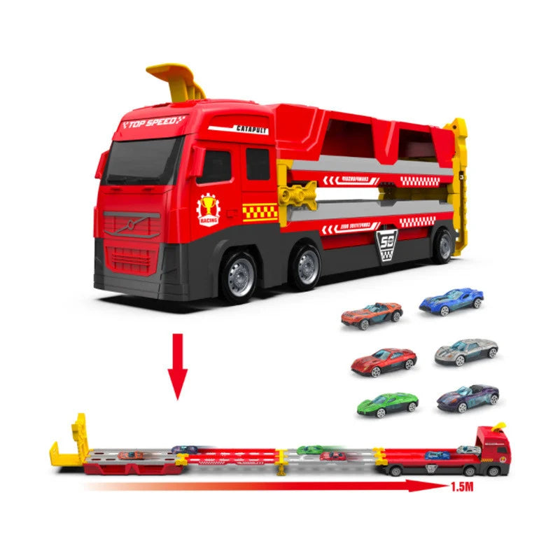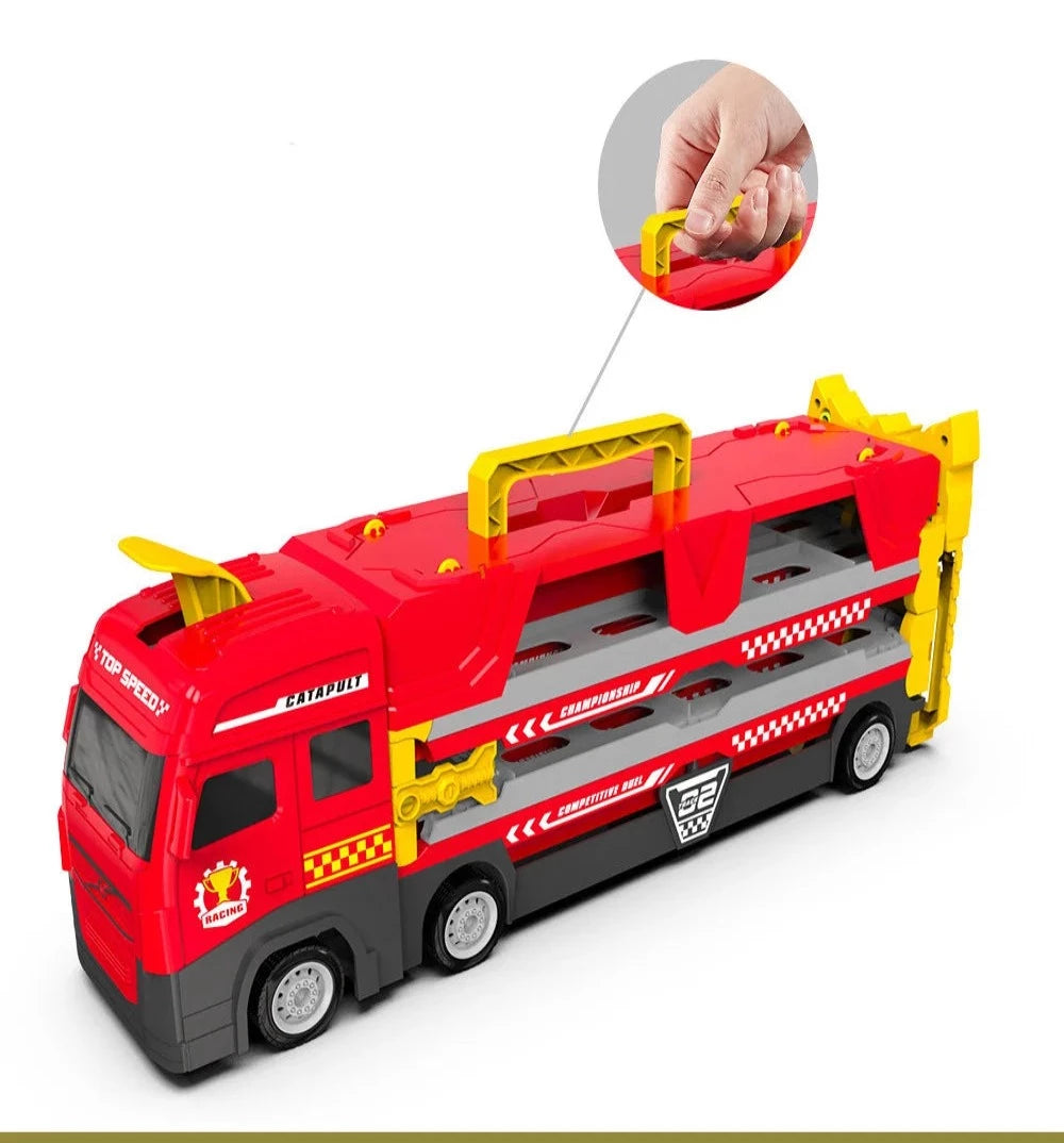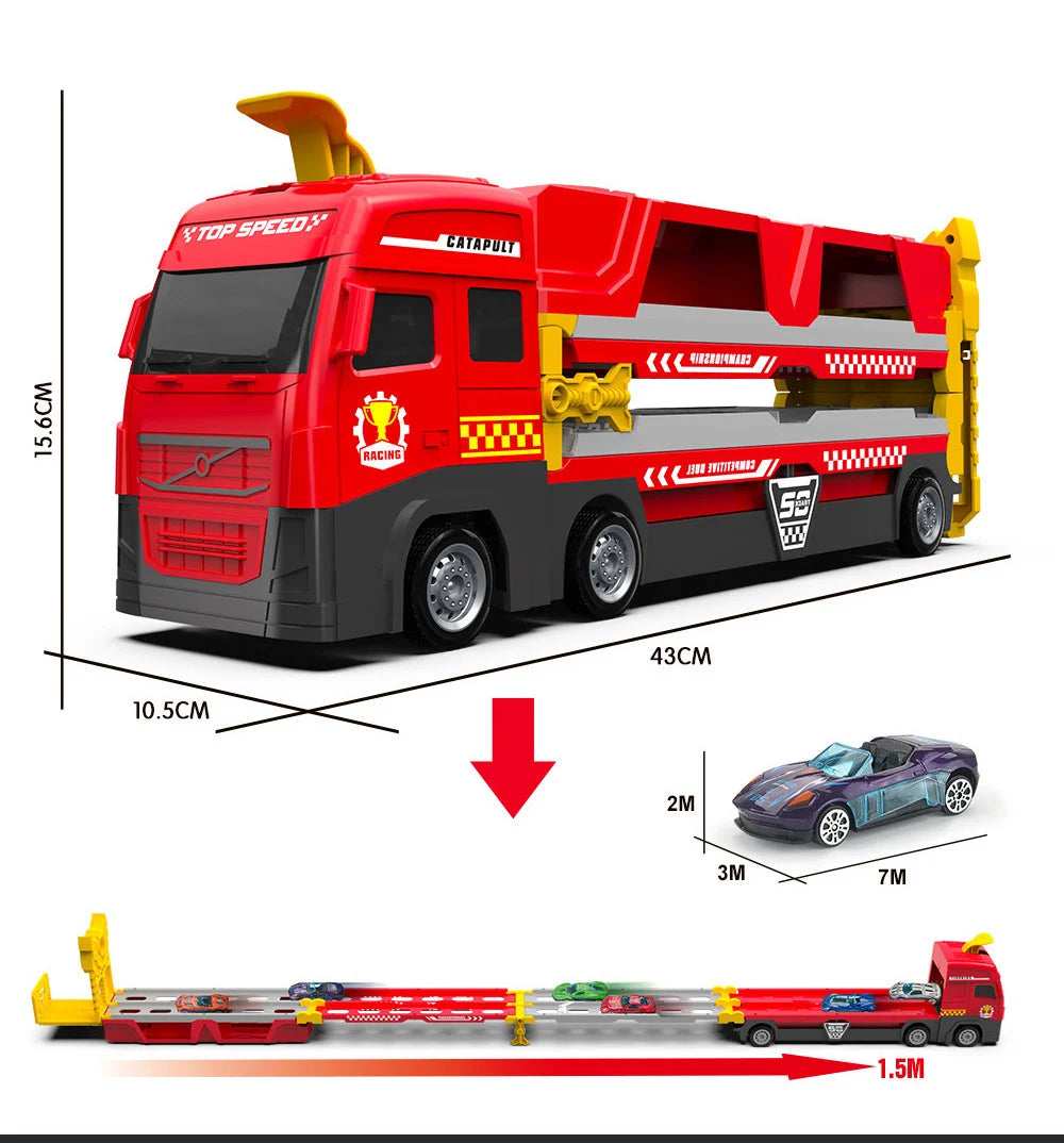 Džinovski transportni kamion sa katapultnom stazom drži više malih automobila! Djeca mogu utovariti svoje omiljene male automobile u kolica za skladištenje katapulta na stazi i lako ih sklopiti