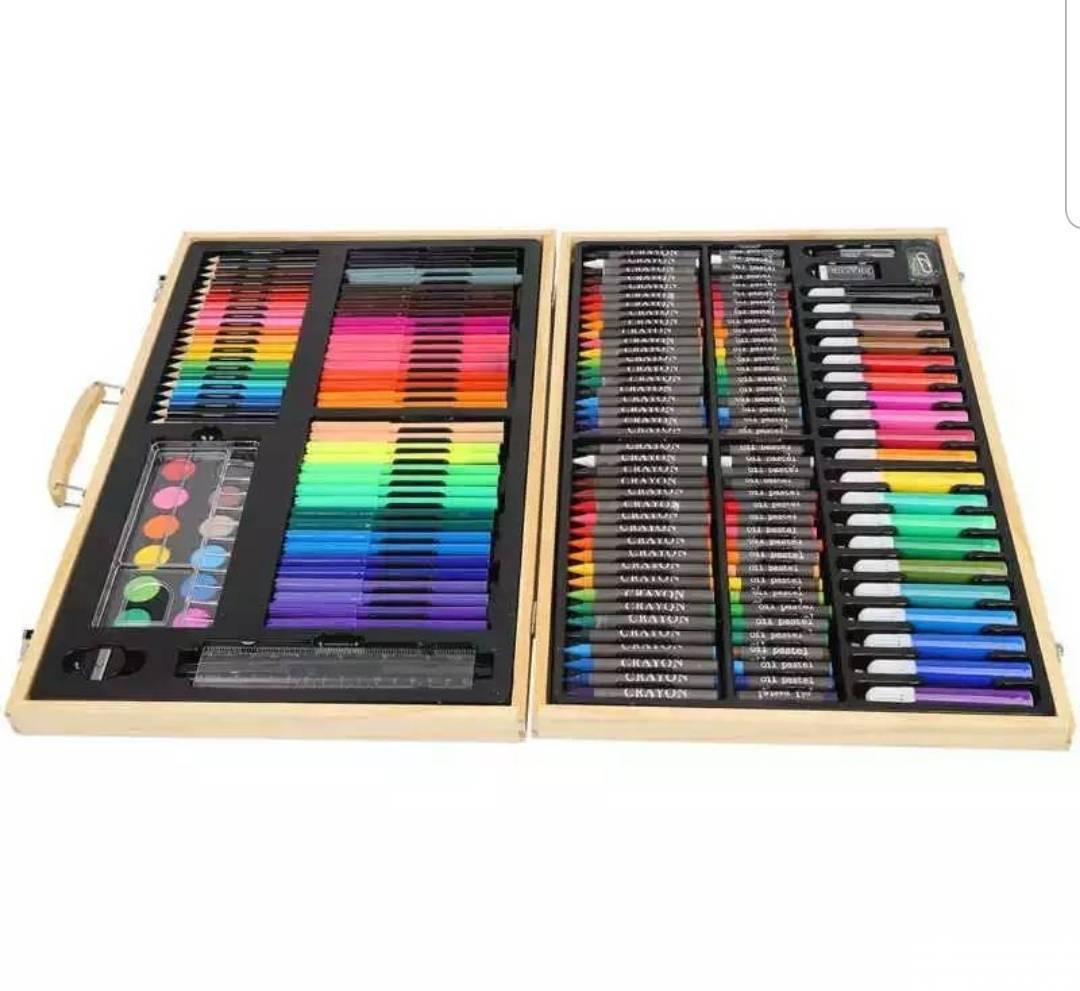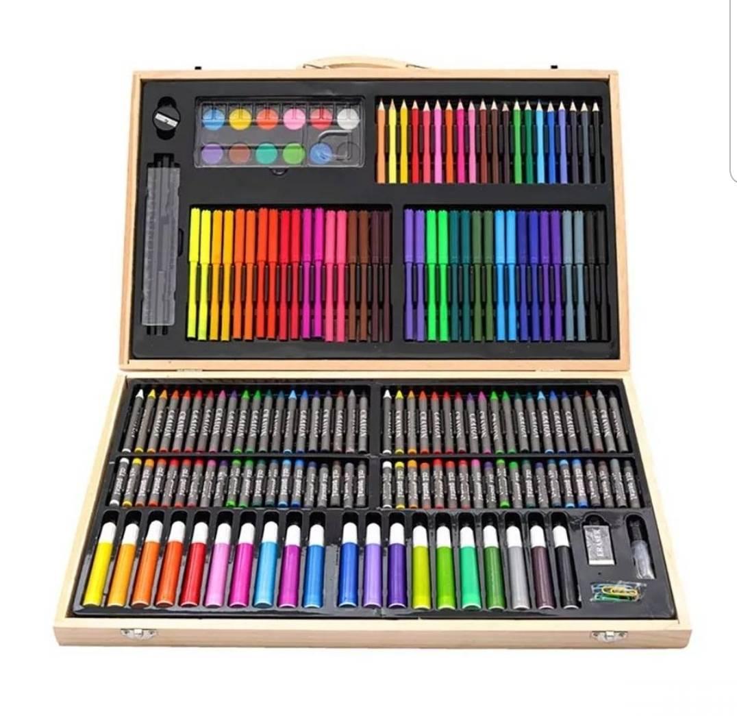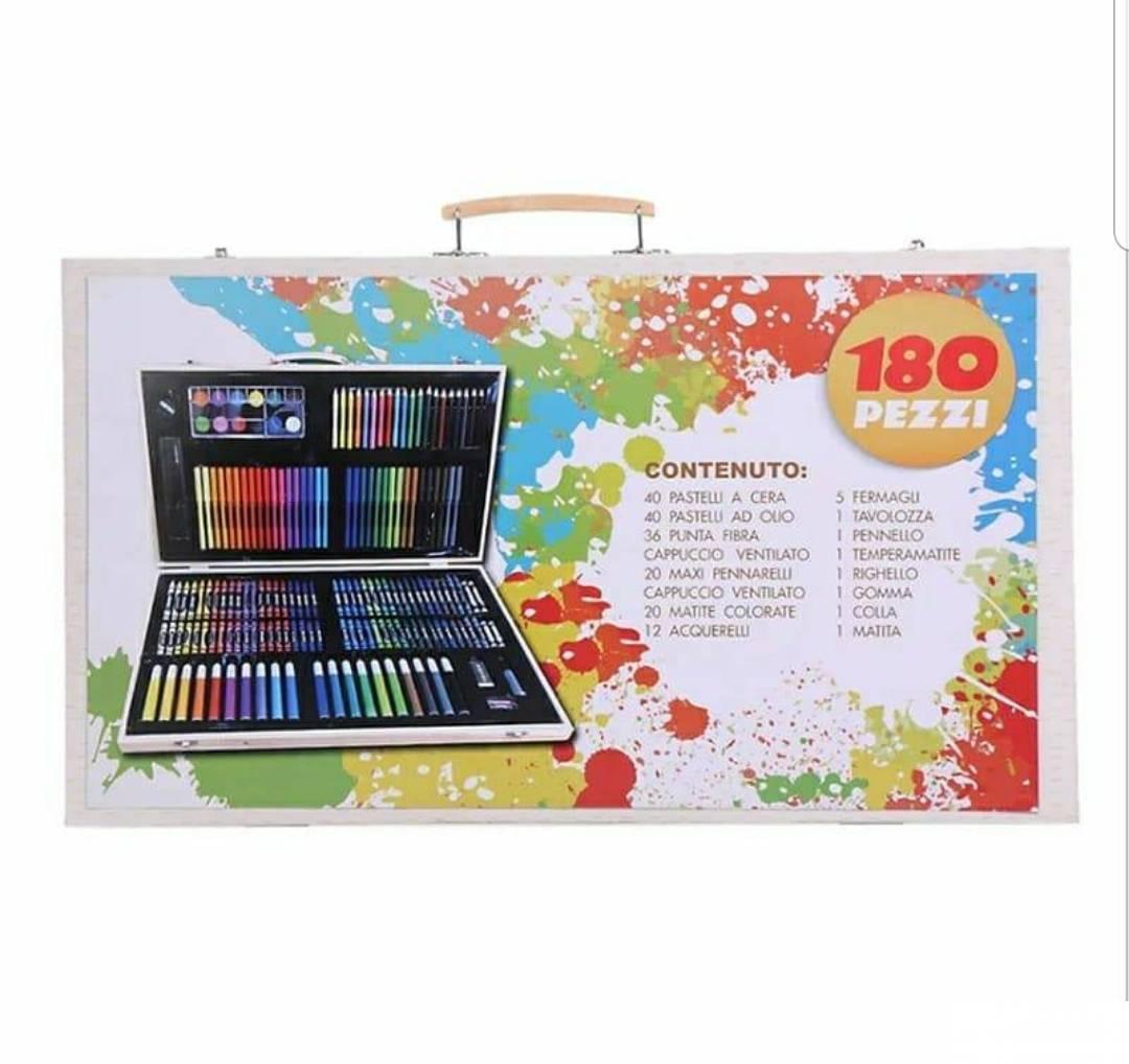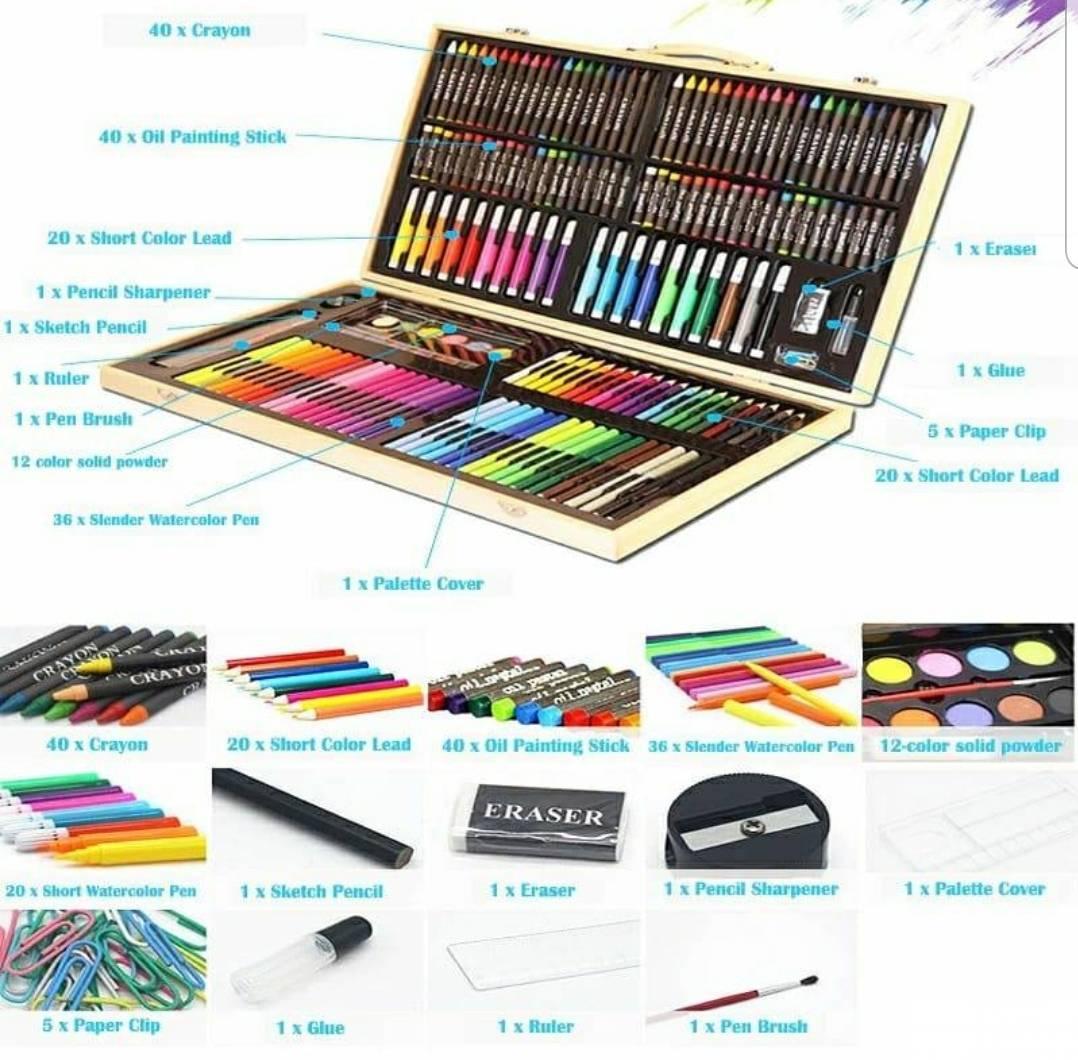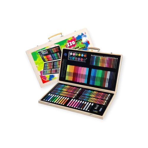 Set za umetničko stvaralaštvo od 180 ili 220 komada uključuje mnoštvo bojica, pastelnog sirovog ulja, olovaka u boji, debelih akvarel olovaka, finih akvarel olovaka, akvarelni akvarel prah, spajalice, šiljalo za olovke, četkicu, olovku za skice, tečni lepak, gumicu, lenjir i drveni kofer, kako bi inspirisali decu i ljubitelje slikanja na kreativnu stranu i da uvek imaju svoj pribor spreman. Sve što jednom malom umetniku treba da povuče prvu liniju svog umetničkog stvaranja.