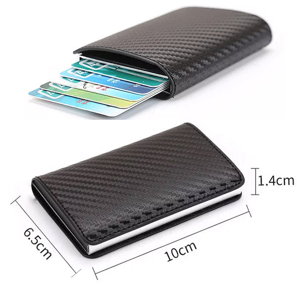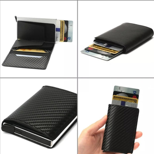 Novčanik za kartice s RFID zaštitom omogućuje vam lak pristup kreditnim karticama ili za lične dokumente. Jednim klikom na dno novčanika kartice će iskočiti i lako ćete ih izvaditi.