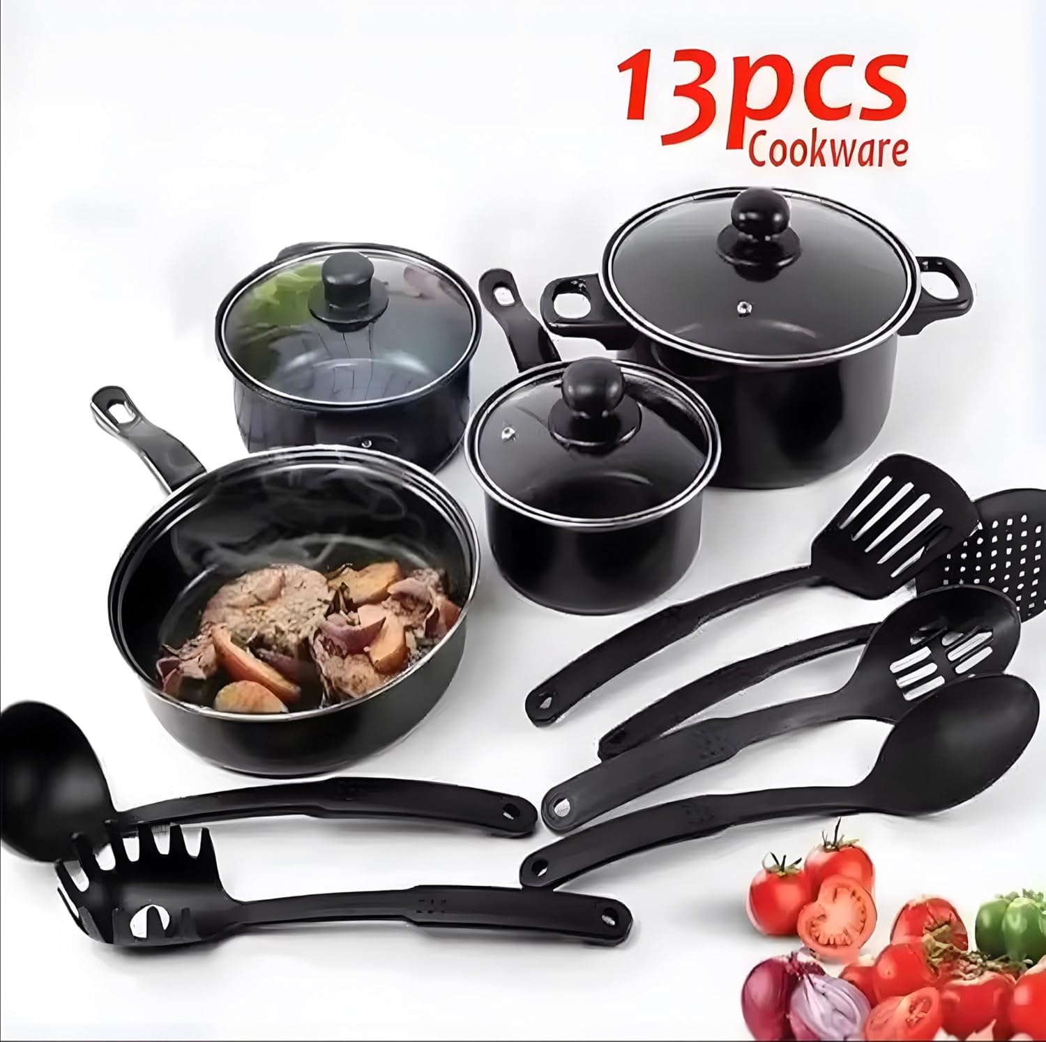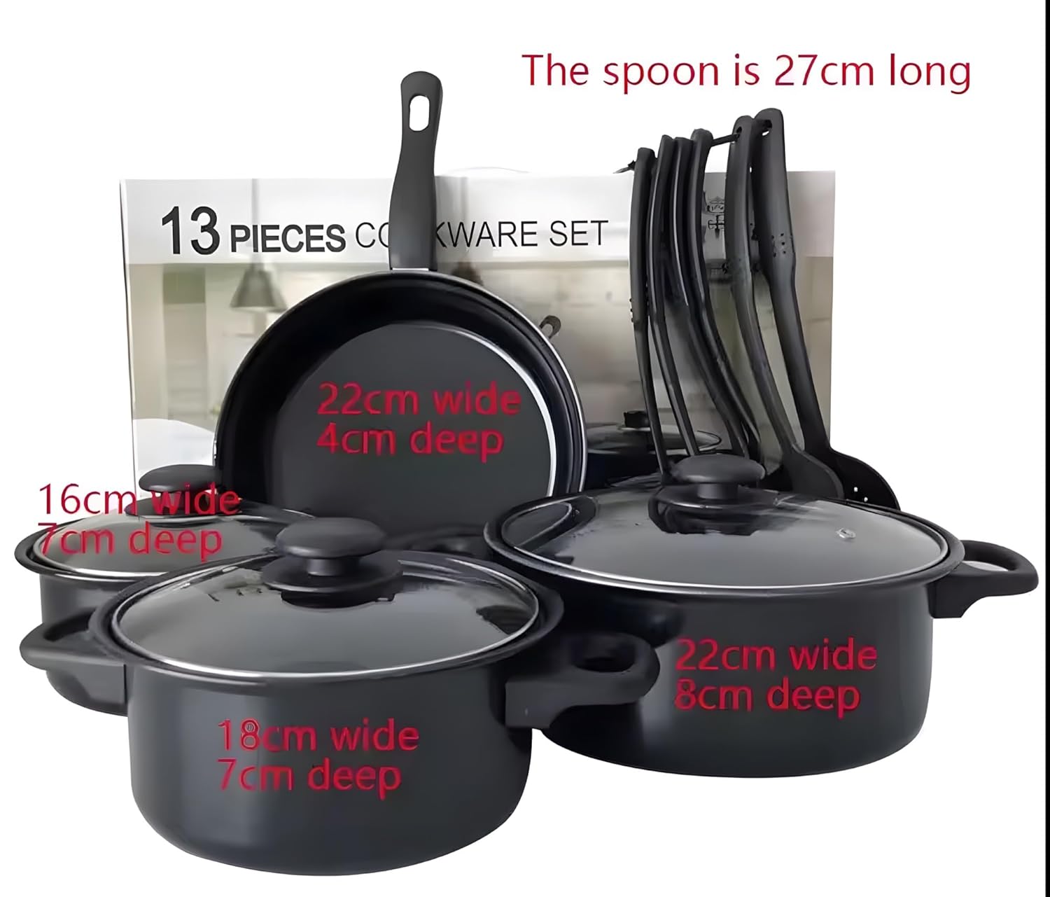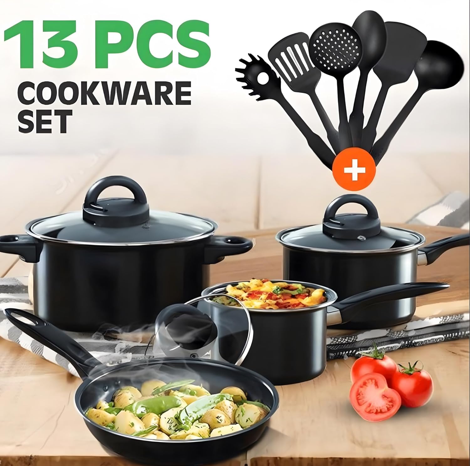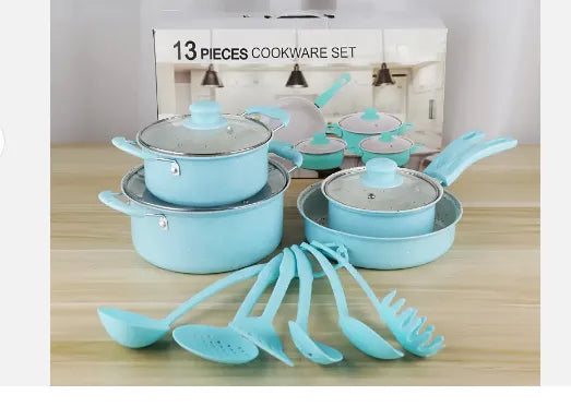 Kuhinjski set za kuvanje dolazi sa 1 tiganjem, 2 šerpe, 1 posudom za sos, 3 poklopca i setom od 6 kuhinjskih alatki (kutlača, spatula, lopatica, rešetkasta lopatica, kašika za skidanje pene i server za špagete).