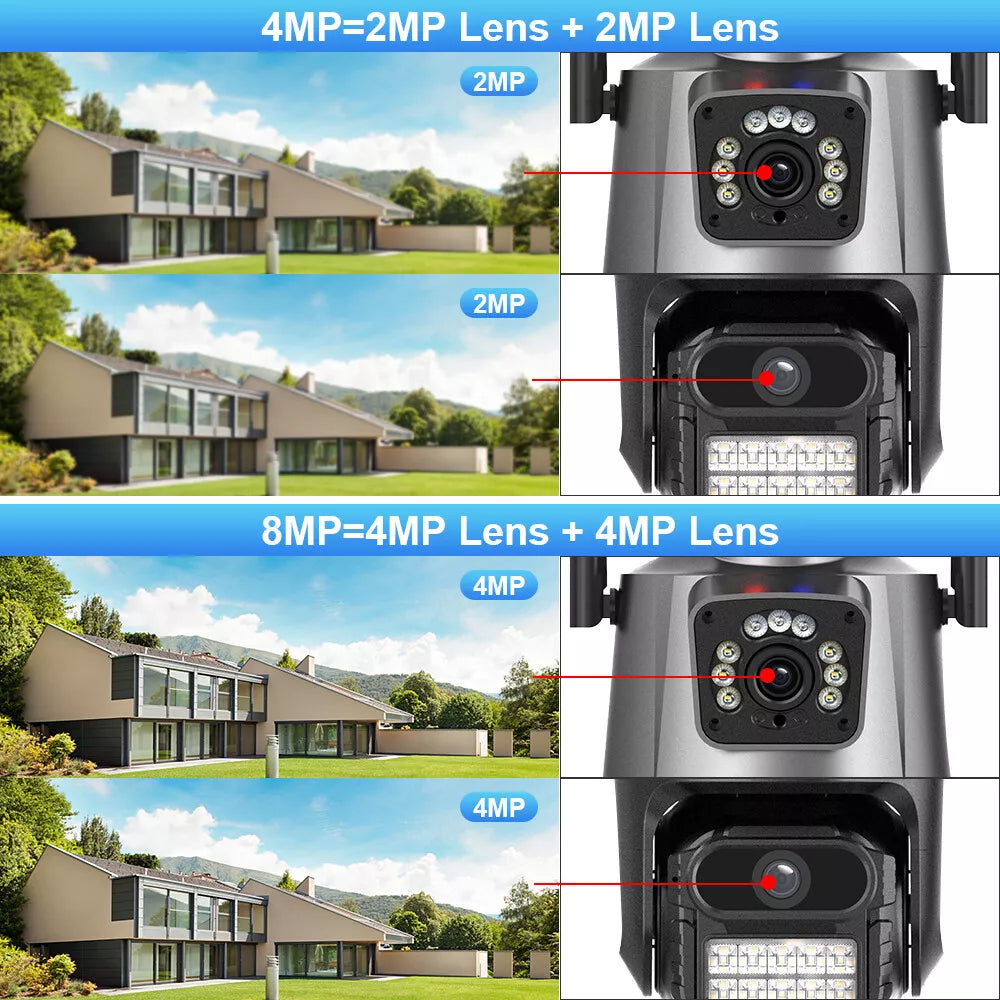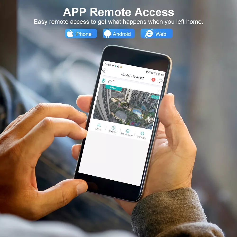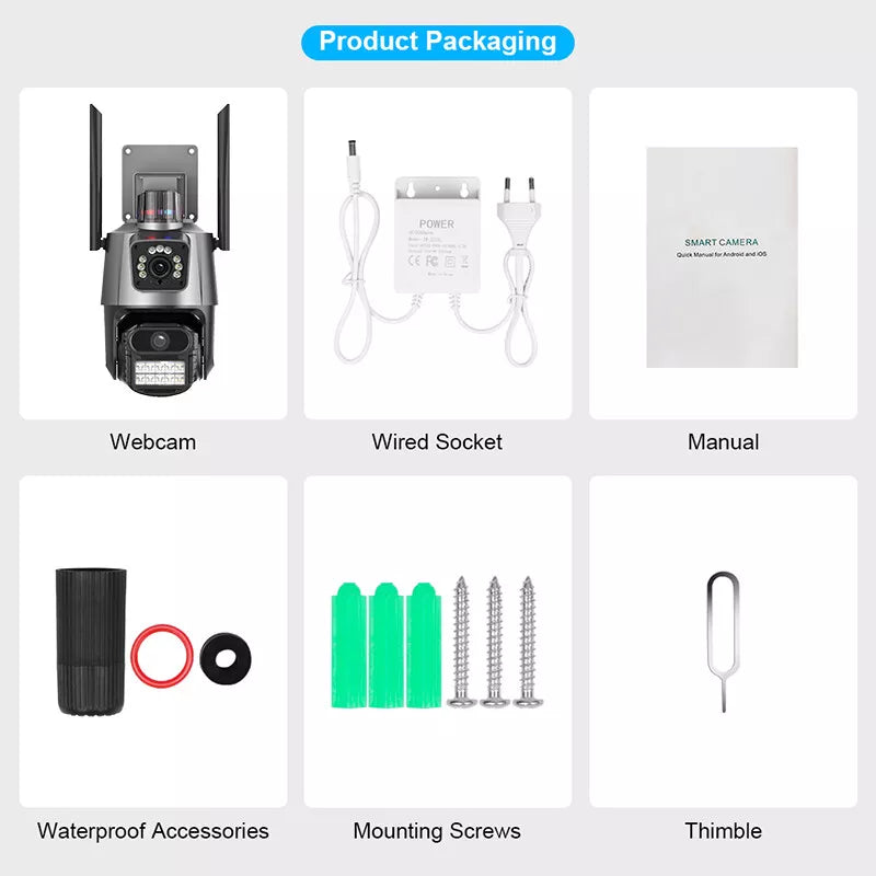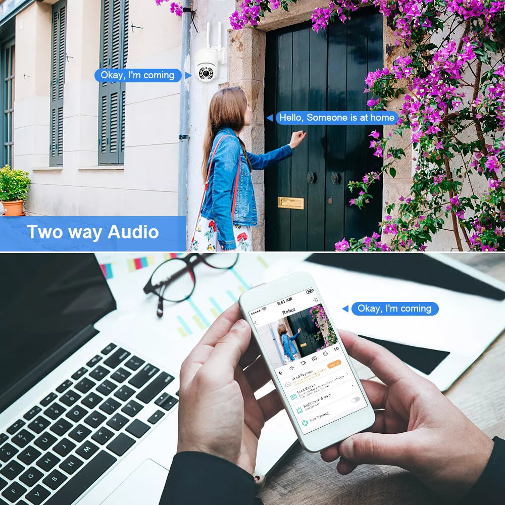Dve Wi-Fi kamere u jednom kućištu. Jedna je fiksna, druga ima mogućnost rotacije za bolji pregled okoline koja se snima. Putem aplikacije je moguć pregled preko mobilnog telefona (dual pregled). Ima mogućnost dvosmerne audio komunikacije. Ugrađena sirena za hitne slučajeve. Pomoću priloženog nosača može se montirati na zid ili plafon